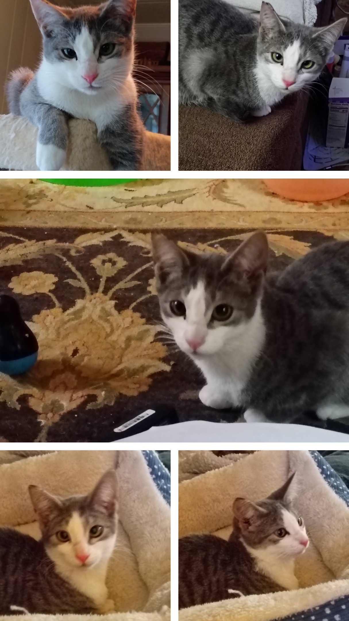 Luna and Callie are 6 month old female kittens. They have both been spayed and have had all their shots. They were born to a feral mom but have been in the house with me for a few weeks. I have been socializing them, but they really need one on one with someone that can give them the love and attention they need. Here, they are always in competition with other cats. I would really like for them to stay together. They are very bonded and love to play together. Luna is the grey and white one and Callie is the Calico.. I am asking $40 for a rehoming fee for both of them. I am located in the Puyallup/Summit area off of Canyon Road